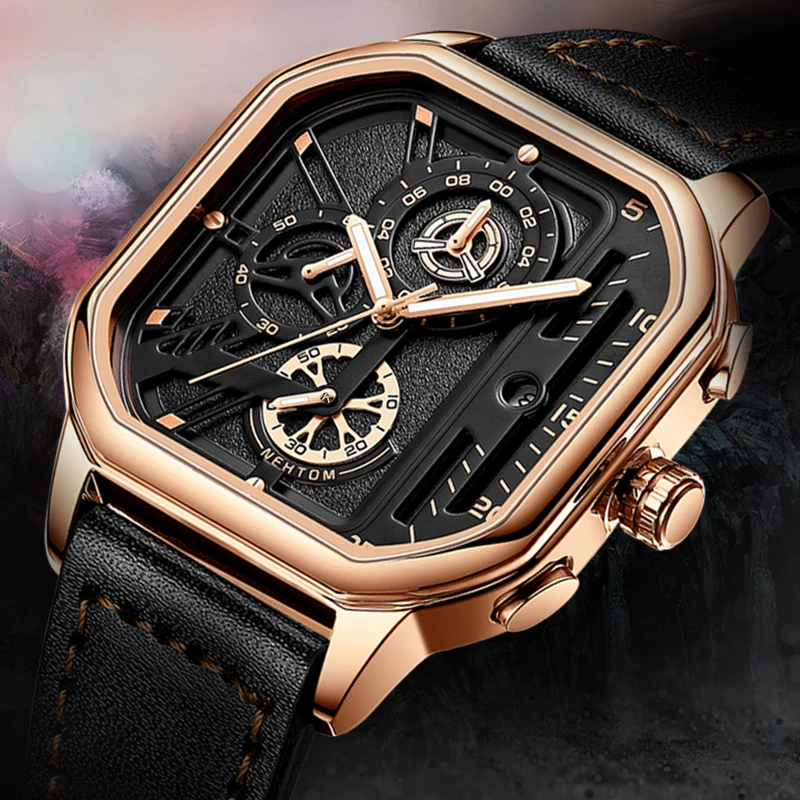 Exquisite Luxury Men's Sports Quartz Watch, Waterproof, Leather Strap, Chronograph, Luminous, Square Skeleton Dial