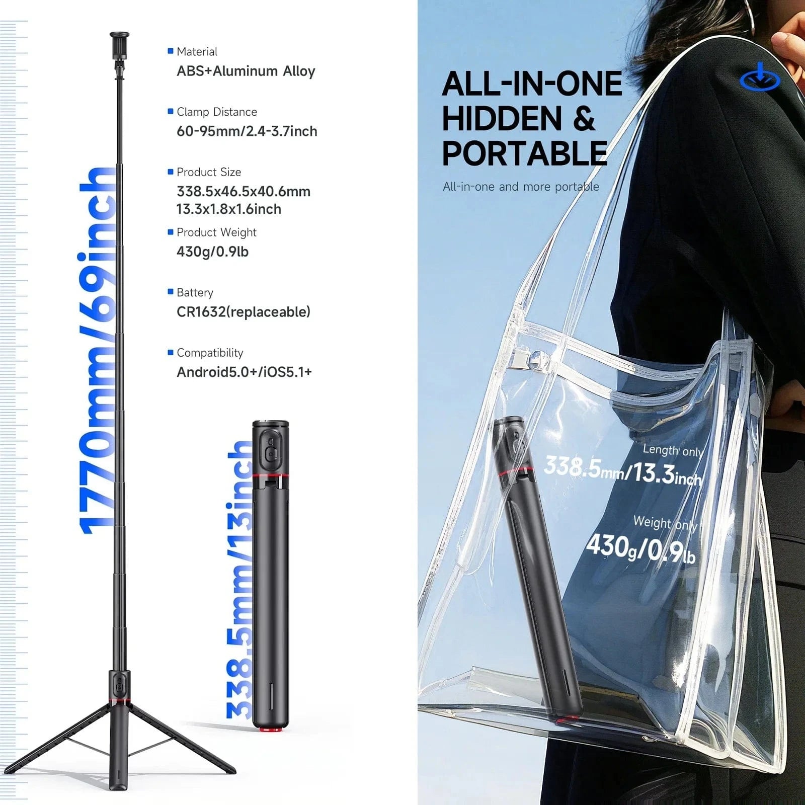 Automatic Pop Open Phone Tripod with 70" Extendable Selfie Stick & Magnetic Remote