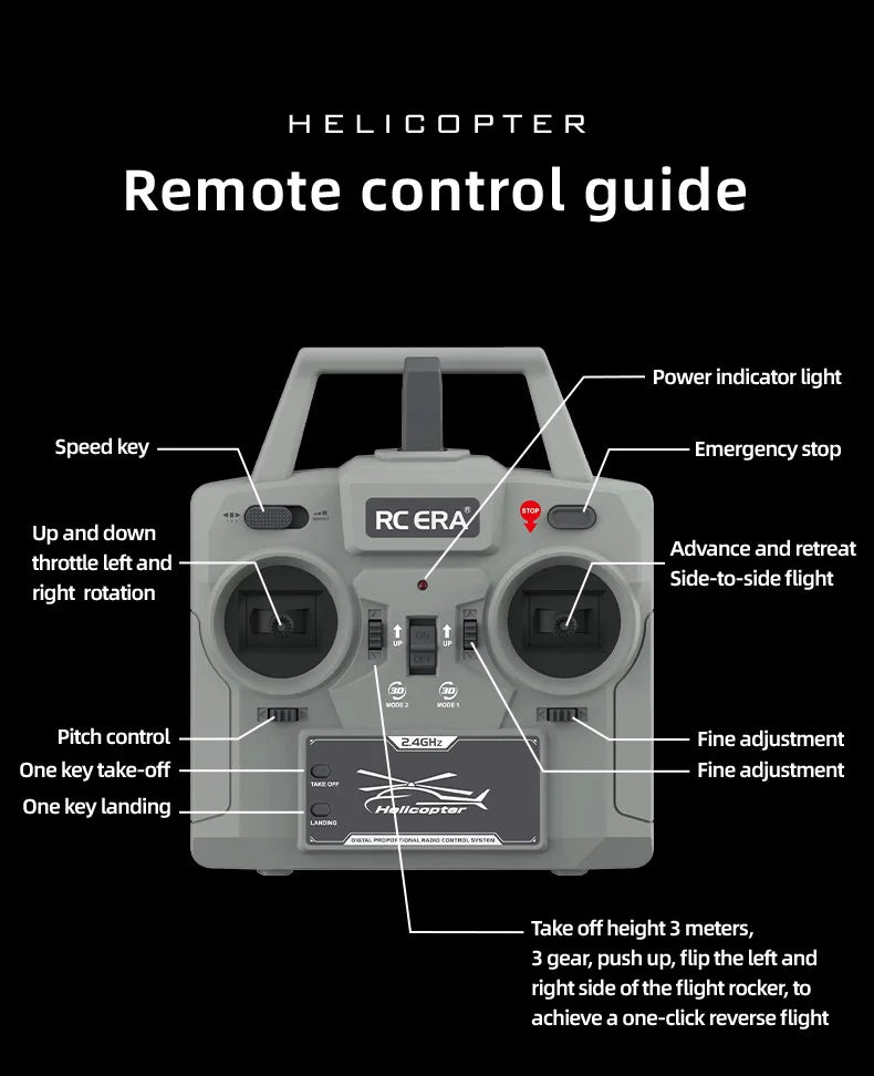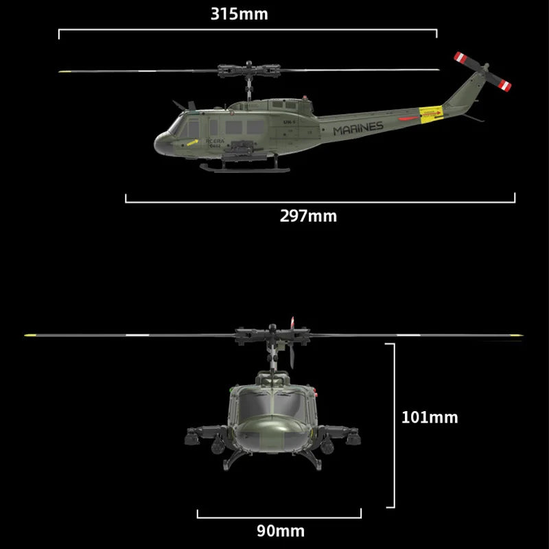 The RC ERA C032 (UH-1) 6-Channel Helicopter is a high-precision scale remote-controlled aircraft engineered for stable flight, advanced maneuvering, and immersive realism. Designed with an aileron-free single-blade system and intelligent positioning technology, this helicopter delivers smooth handling, excellent wind resistance, and professional-level control for hobbyists and enthusiasts.