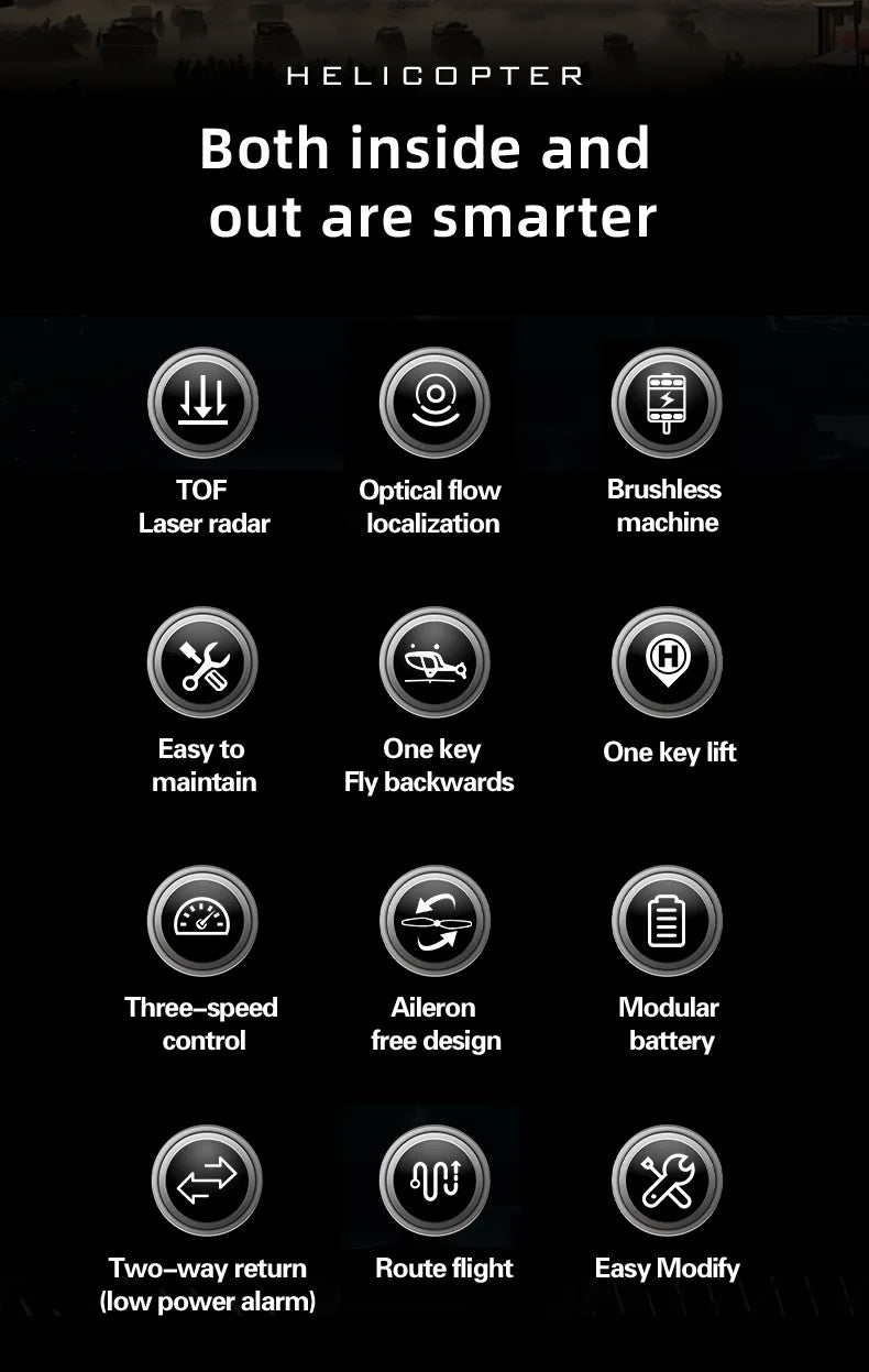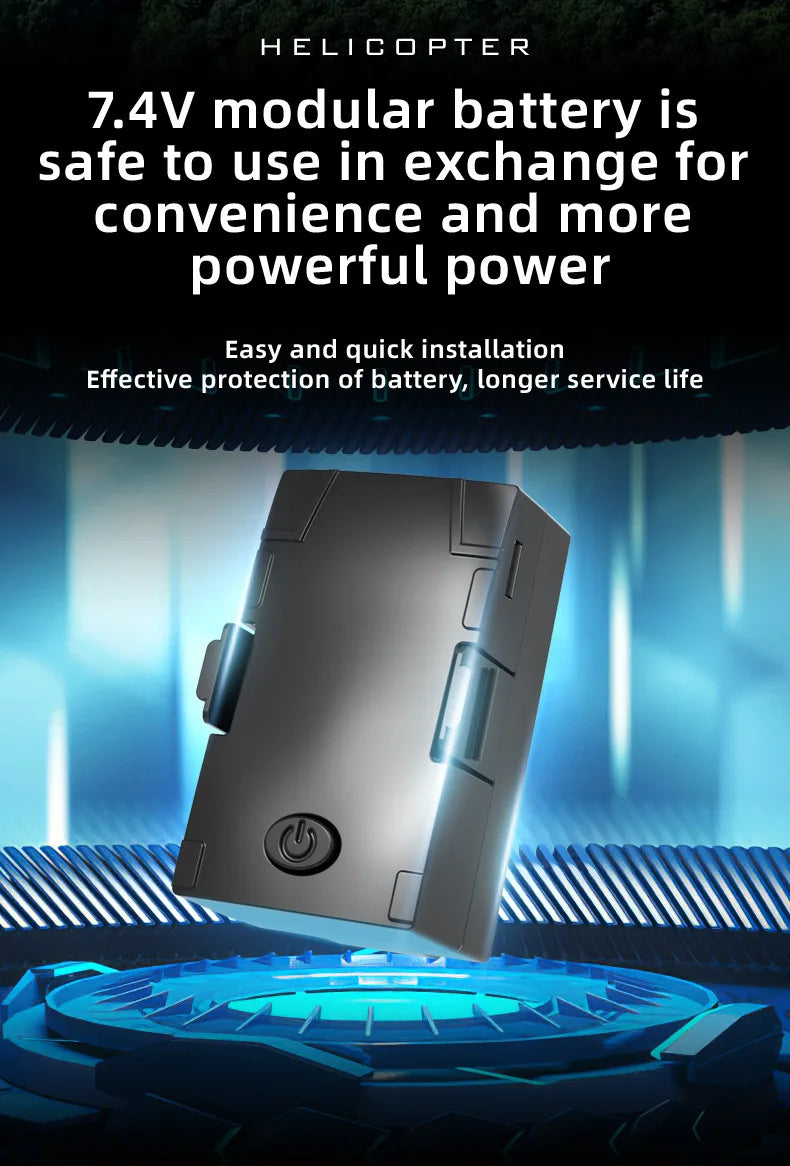 Includes low-voltage alarm, locked-rotor protection, loss-of-control protection, large/small rudder switching, one-key takeoff, and one-key landing.