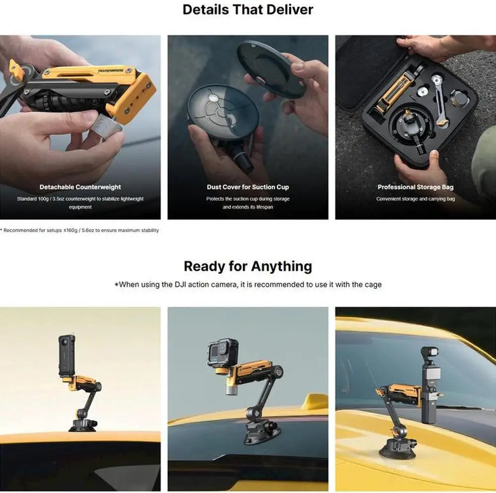 The 4-inch vacuum suction cup provides secure, high-strength adhesion on clean, flat surfaces. Designed to maintain stability even during high-speed movement, ensuring reliable camera support.